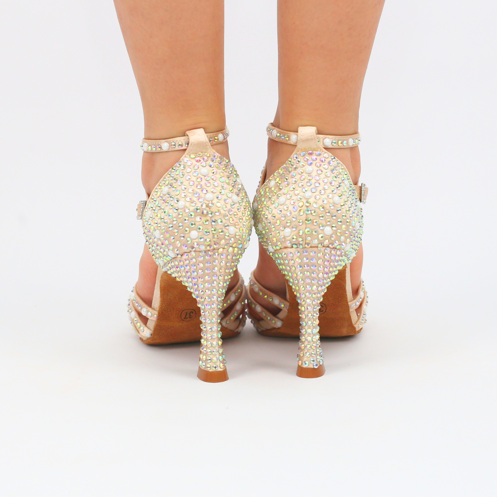 Pantofi de dans cu toc cuban din colecție proprie confecționați din satin cu aplicație de ornamente. Partea superioară accesorizată cu ornamente de culoare albă. Pietrele aplicate manual adaugă o notă de strălucire și eleganță, alegerea perfectă pentru nuntă și dansul mirilor.