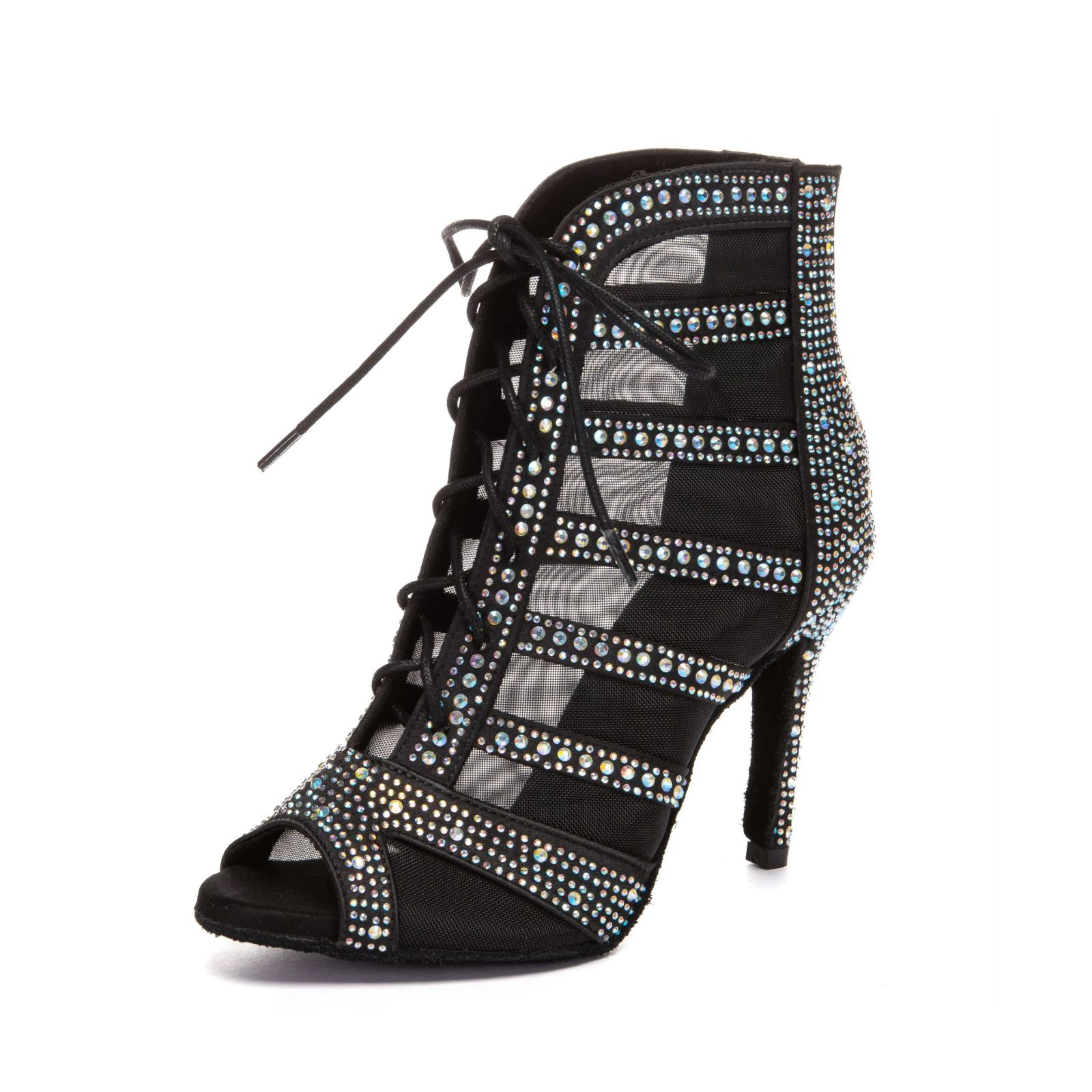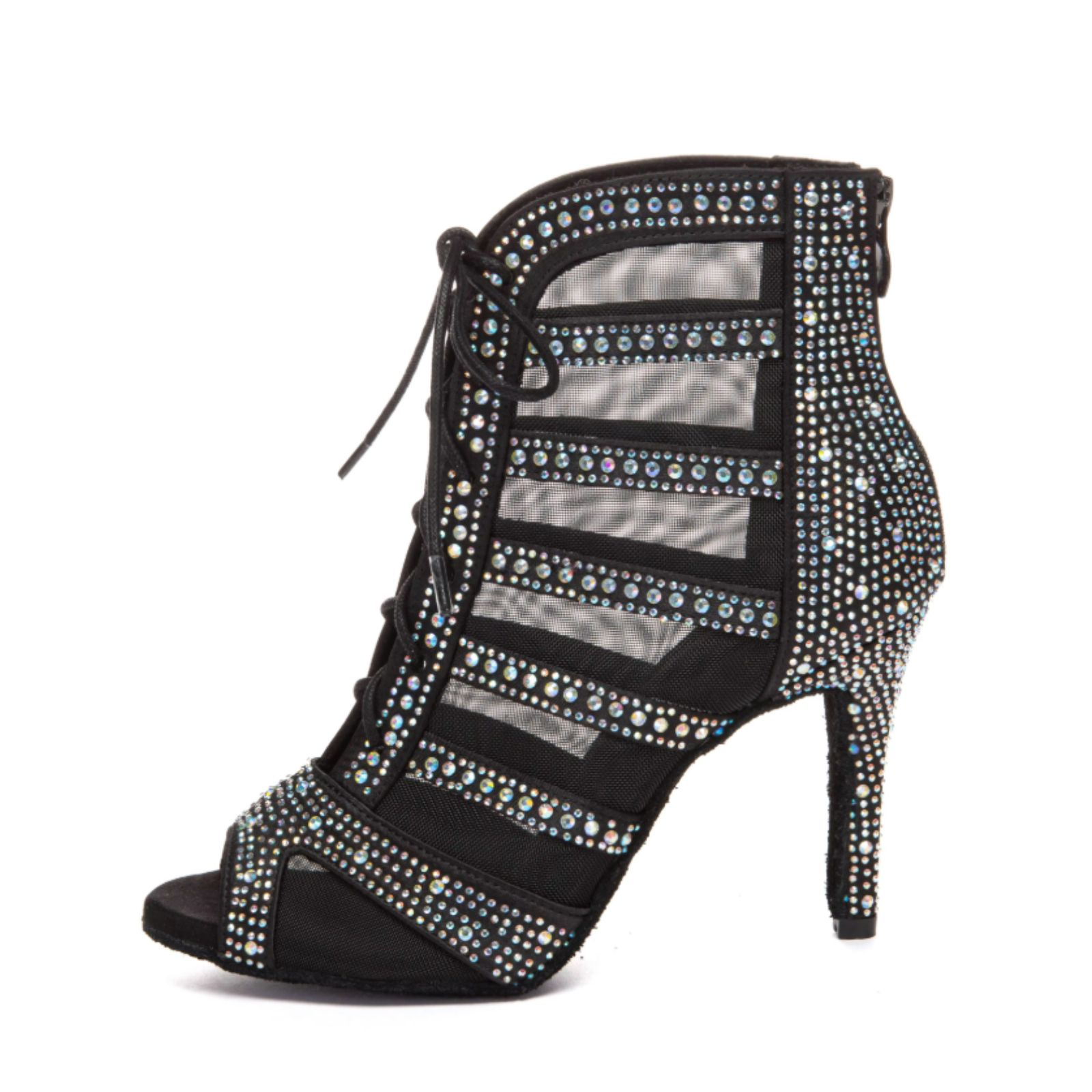 Botine de dans cu un design îndrăzneț tip "cage", acoperite cu strasuri Aurora Borealis care reflectă lumina în mii de culori. Structura în benzi orizontale cu inserții de plasă conferă un aspect dramatic de scenă, combinând spectaculosul cu confortul în mișcare.