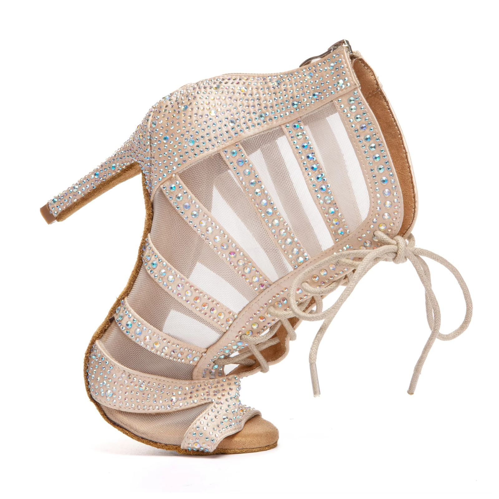 Botine de dans cu un design îndrăzneț tip "cage", acoperite cu strasuri Aurora Borealis care reflectă lumina în mii de culori. Structura în benzi orizontale cu inserții de plasă conferă un aspect dramatic de scenă, combinând spectaculosul cu confortul în mișcare.